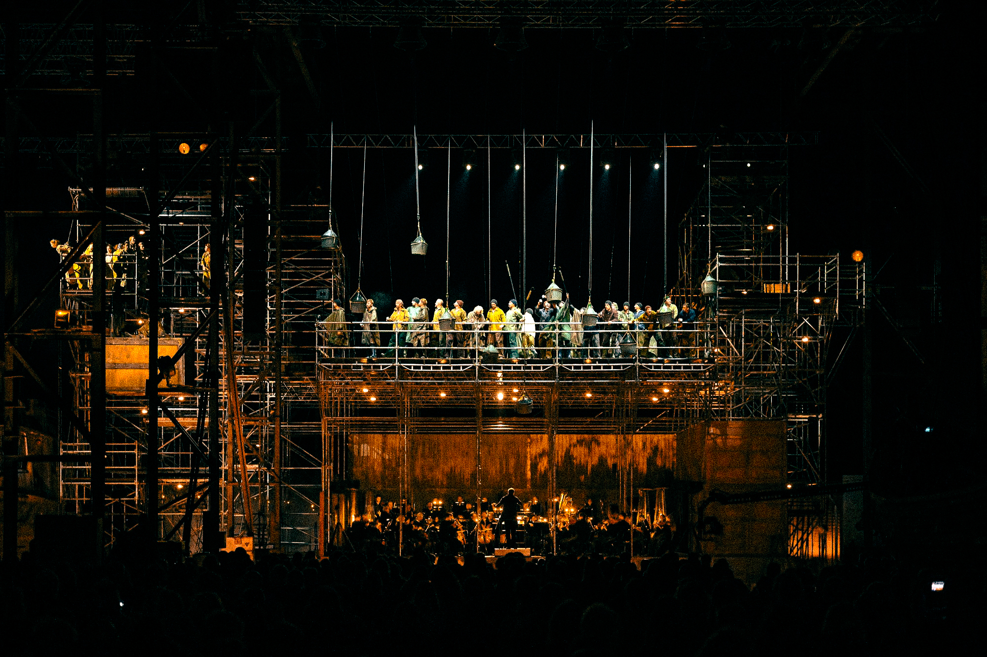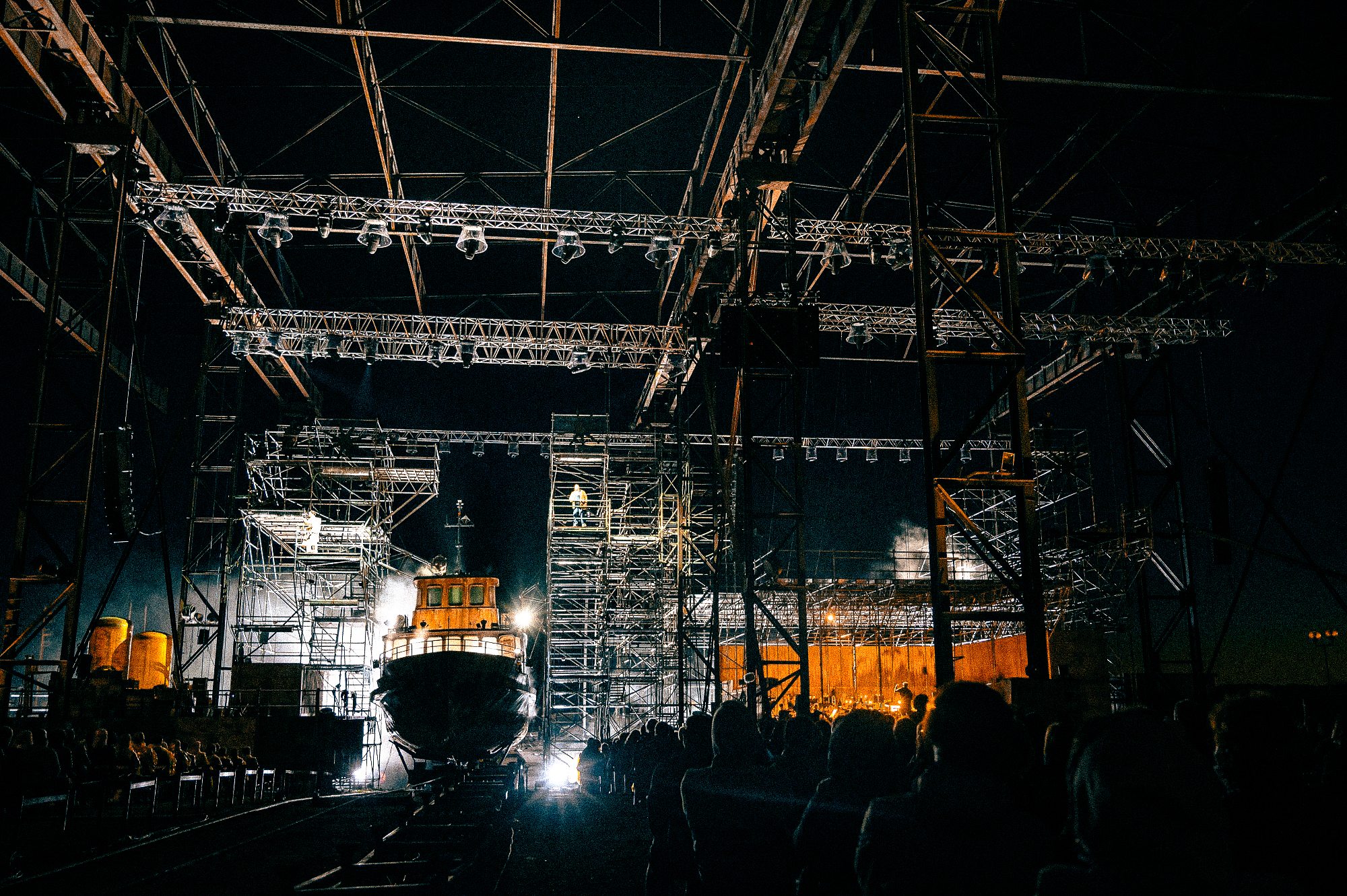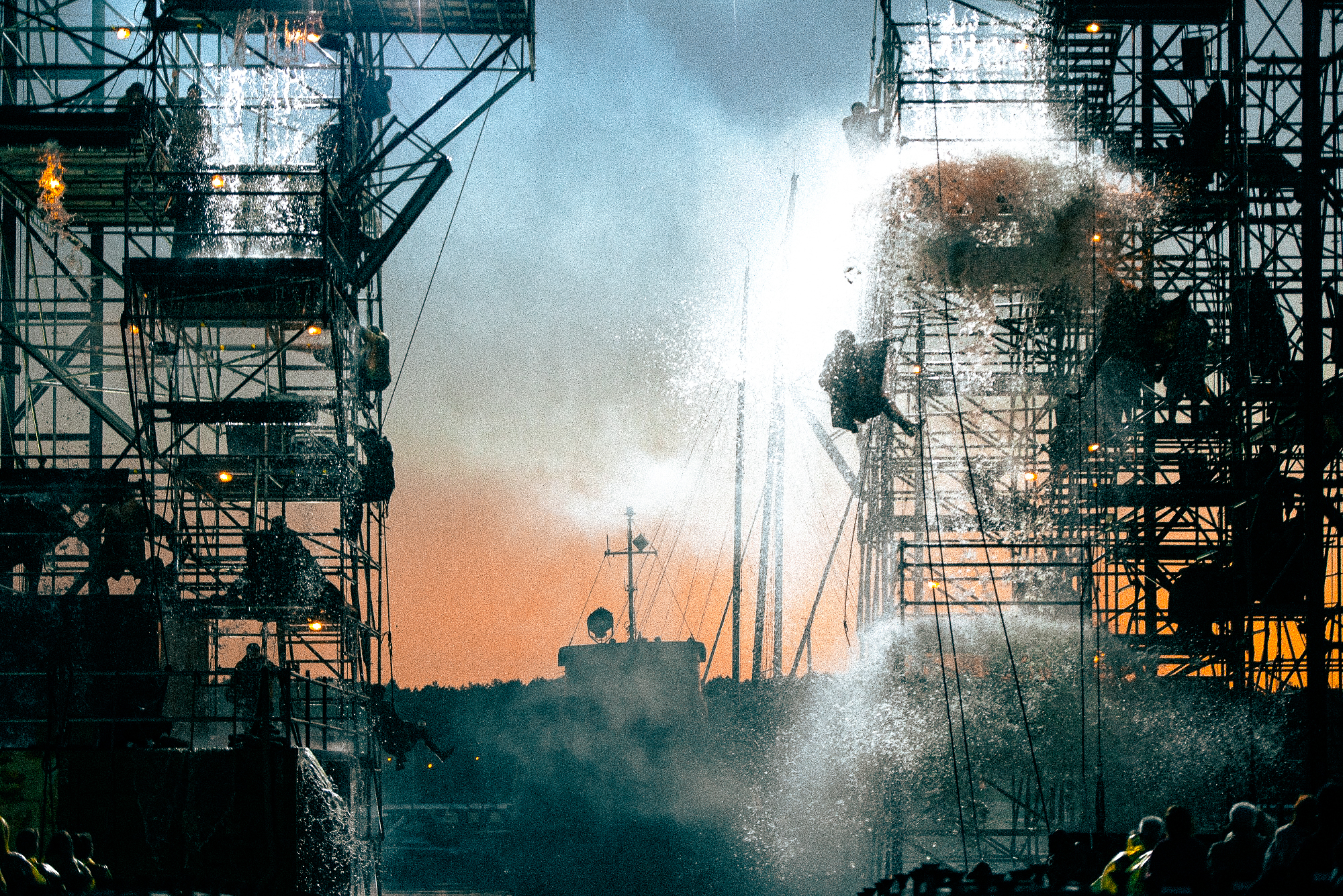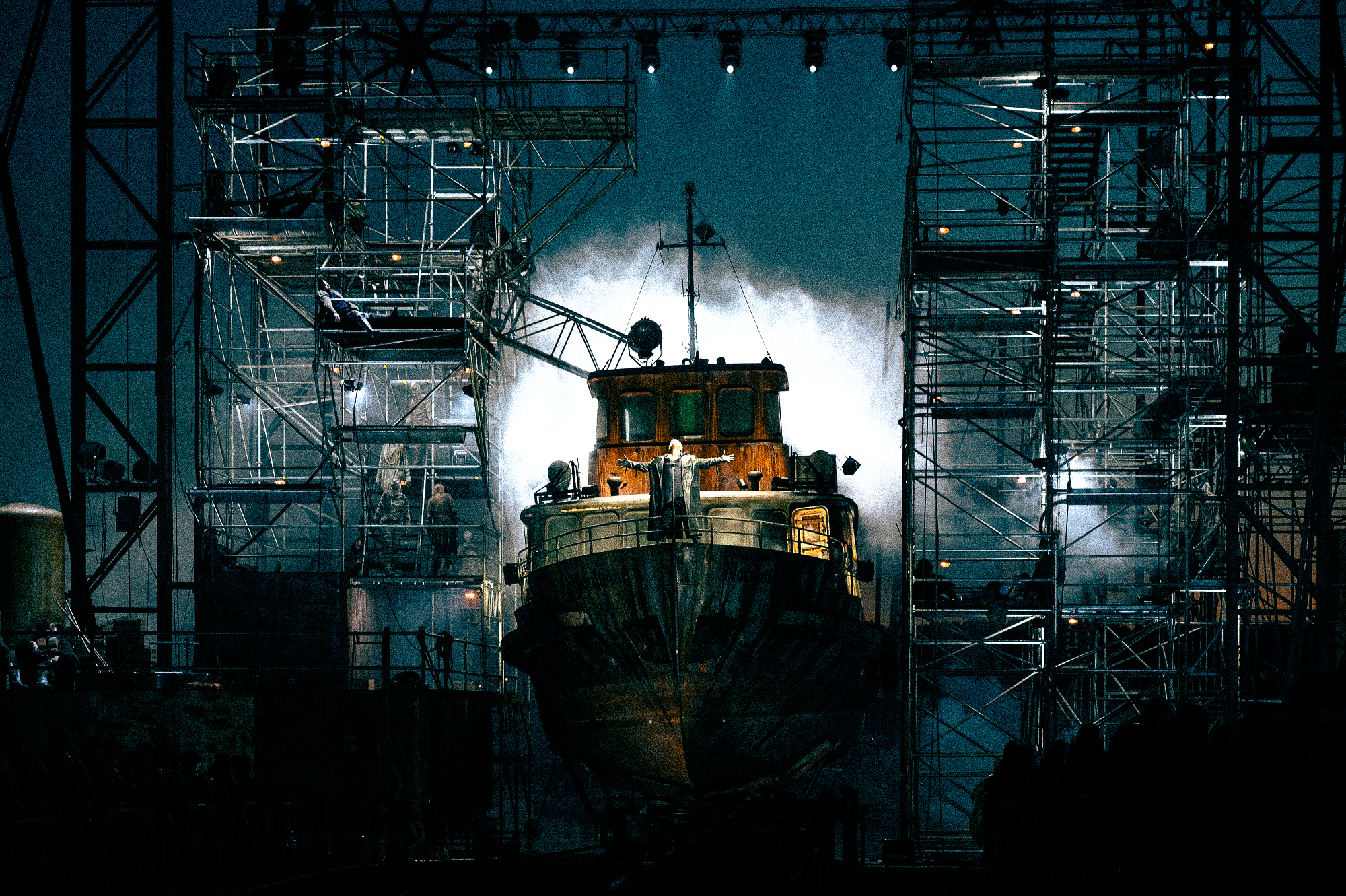 The lighting design for The Flying Dutchman uses dynamic beams, backlighting, and synchronized effects to evoke the power of stormy seas and myth. Sharp, moving lights simulate lightning, cutting through water sprays and fog, while silhouettes and shadows create ghostly outlines against the towering scaffolding and ship. A palette of cold blues and whites contrasts with warm ambers to reflect the tension between fate and salvation. Carefully preprogrammed transitions and effects ensure seamless synchronization with water, music, and movement, delivering a visually immersive and dramatic experience.