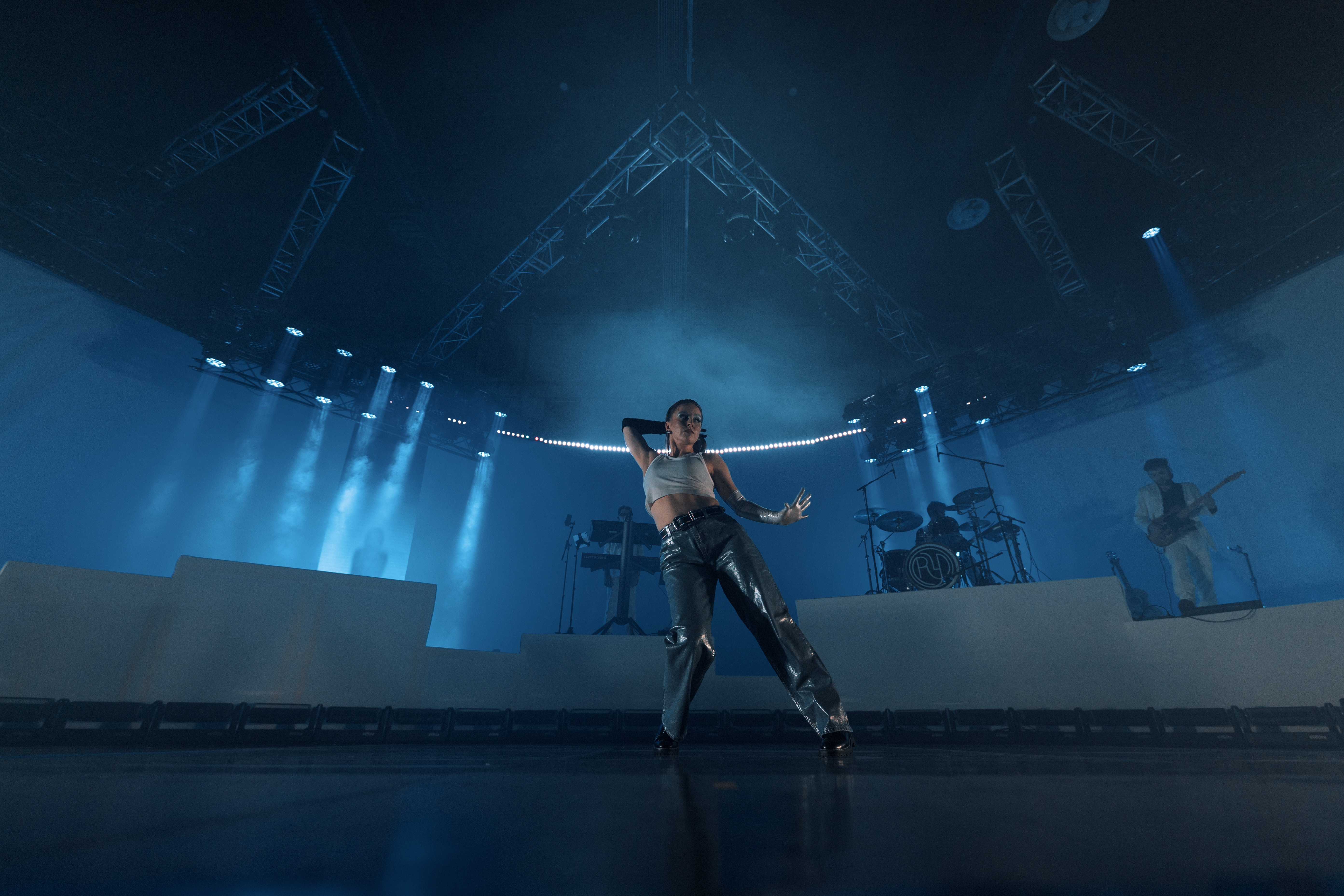 A minimalist stage design with tiered platforms and a sweeping panoramic backdrop, enhanced by dynamic lighting transitions. The concept blends clean architecture with vivid, evolving lights to create an immersive and emotionally resonant performance experience.
